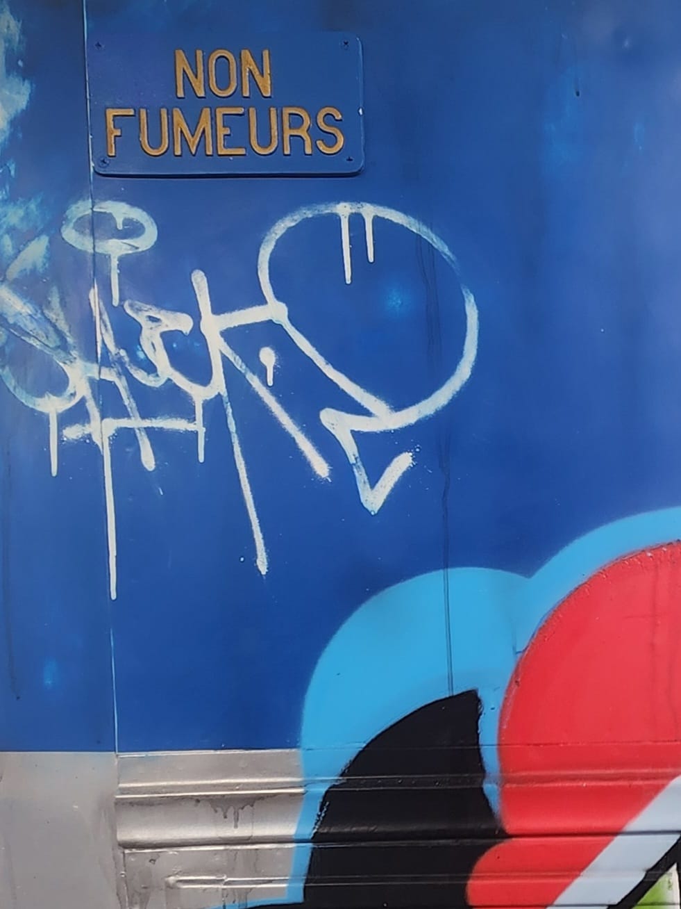 Reproduction partielle d’un graffiti originellement réalisé en 1992, transposé sur deux plaques de résine figurant le train emblématique de la ligne Paris–Saint-Lazare.